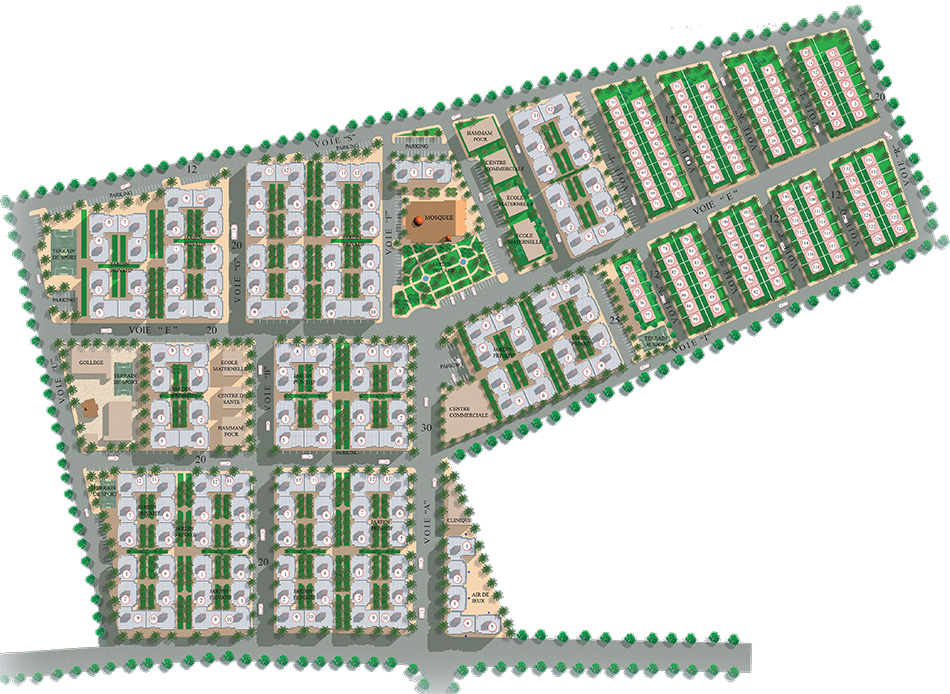 Le projet propose les commodités nécessaires à votre quotidien : Mosquée, école, centre de santé, terrains de sport, commerces et espaces verts. Superficie des villas : 160m² construites Contenance : salon, séjour, salle à manger, chambre parentale avec salle de bain intégrée, 2 chambres enfants, cuisine, buanderie, salle de bain, terrasse, jardin et garage privatif.